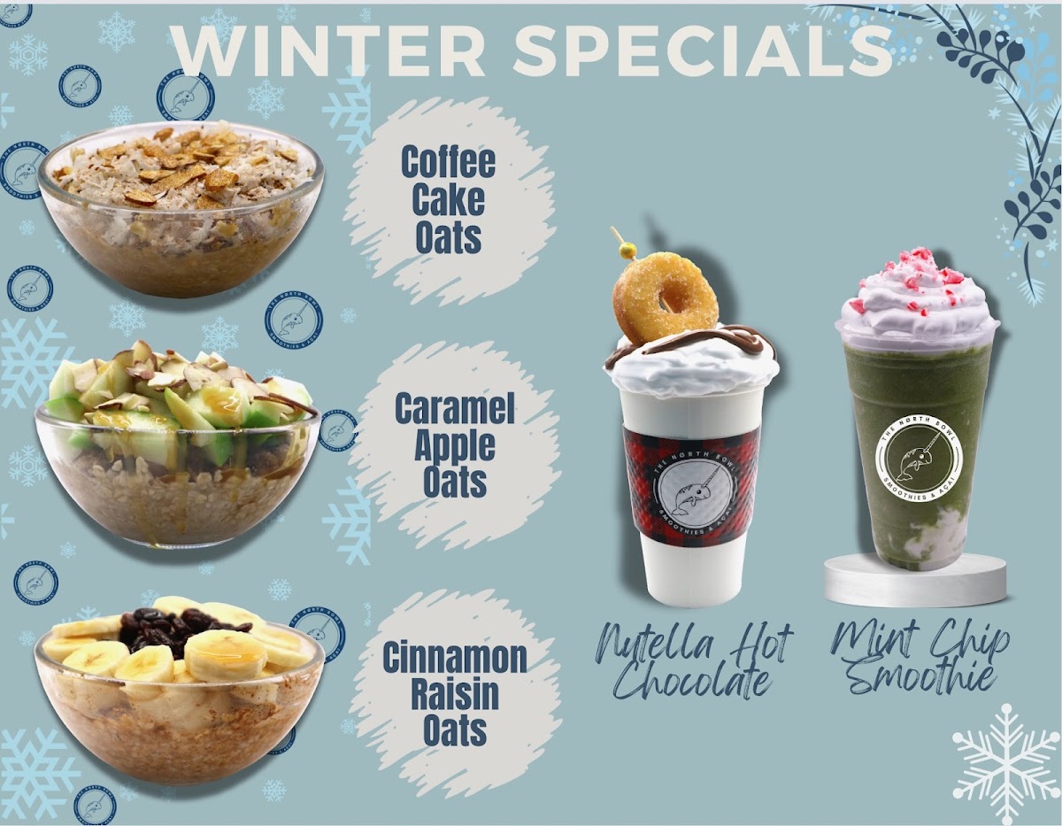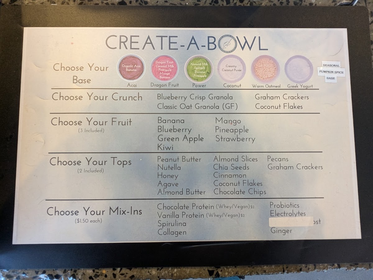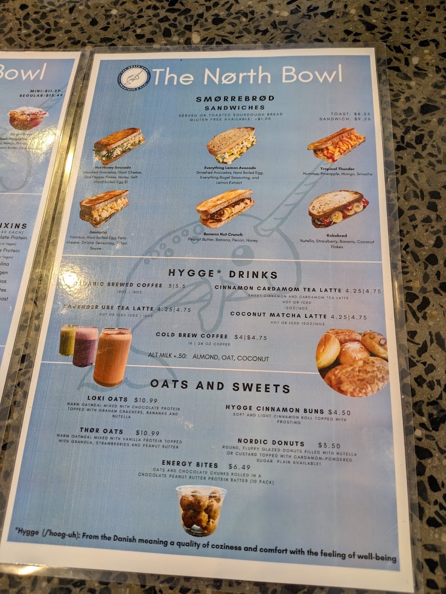 The menu features a delightful array of customizable options, including the Create-A-Bowl where you can mix your choice of base, fruit, and toppings, ensuring every visit is a unique experience. Highlights also include the rich and hearty Thor Oats, paired with warm oatmeal and topped with strawberries and peanut butter.